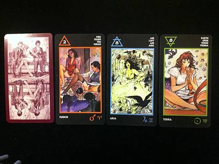 第一張是牌背,第二張是火元素二號牌,再來是風元素八號牌與土元素八號牌,大家也許可以試著跟偉特的杖二、劍八與錢八比較看看,甚至思考看看它為何要這樣呈現。